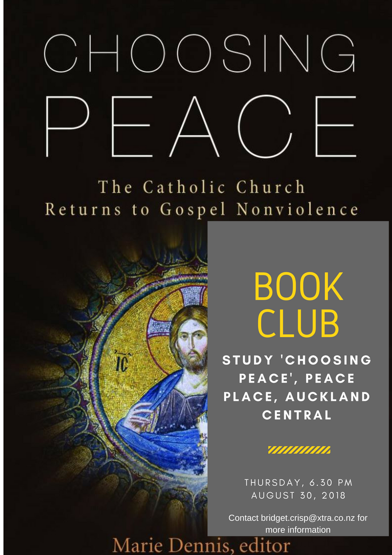 Coming Up in August ...is a Book Club event where Pax Christi will be studying Marie Dennis edited book 'Choosing Peace: The Catholic Church Returns to Gospel NonViolence'. If you are interested contact Bridget Crisp rsm on bridget.crisp@xtra.co.nz . The book club will be at the Peace Place, Auckland...but if you are outside Auckland - why not set up your own book club. The book can be ordered online from your preferred provider.